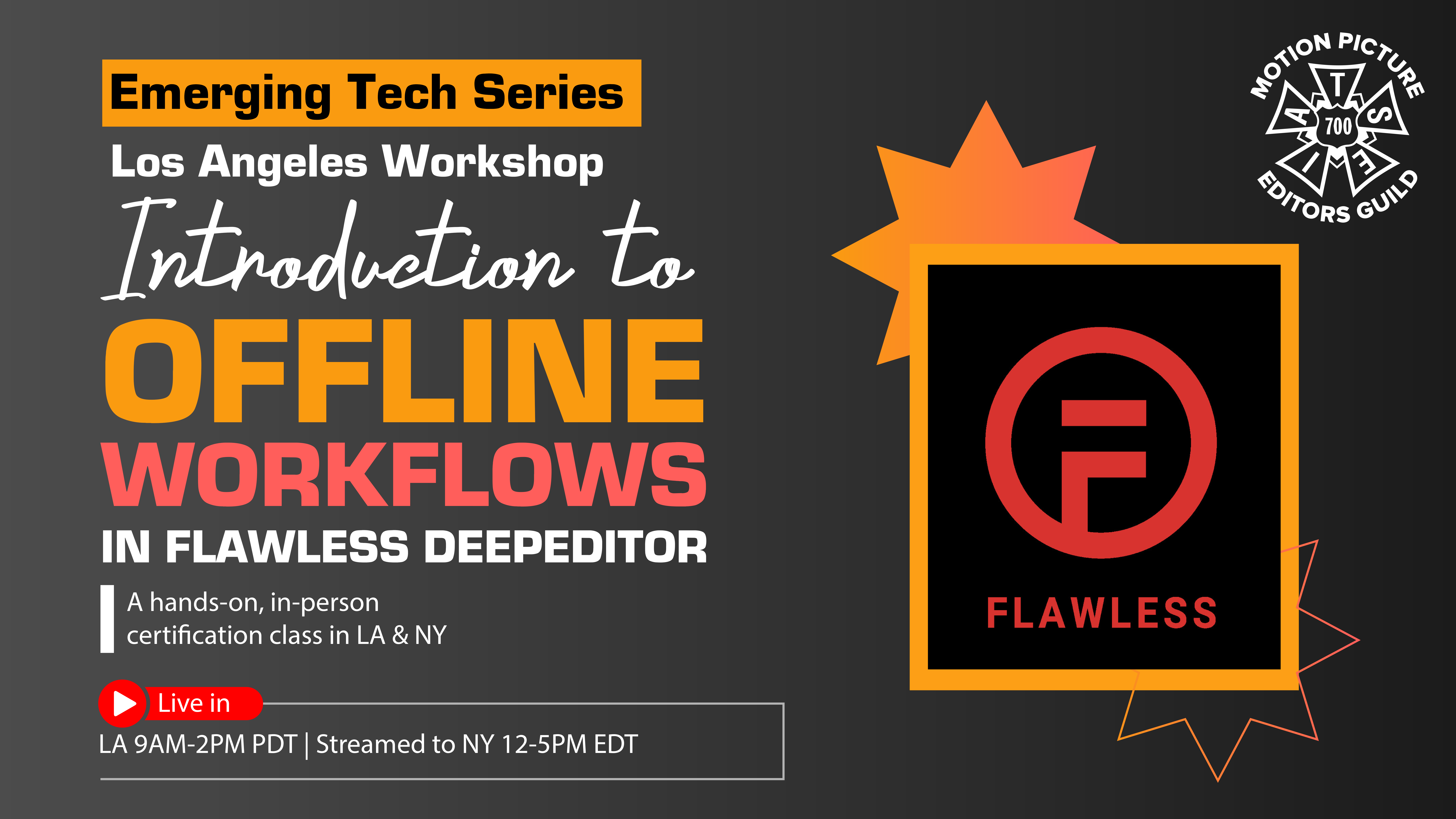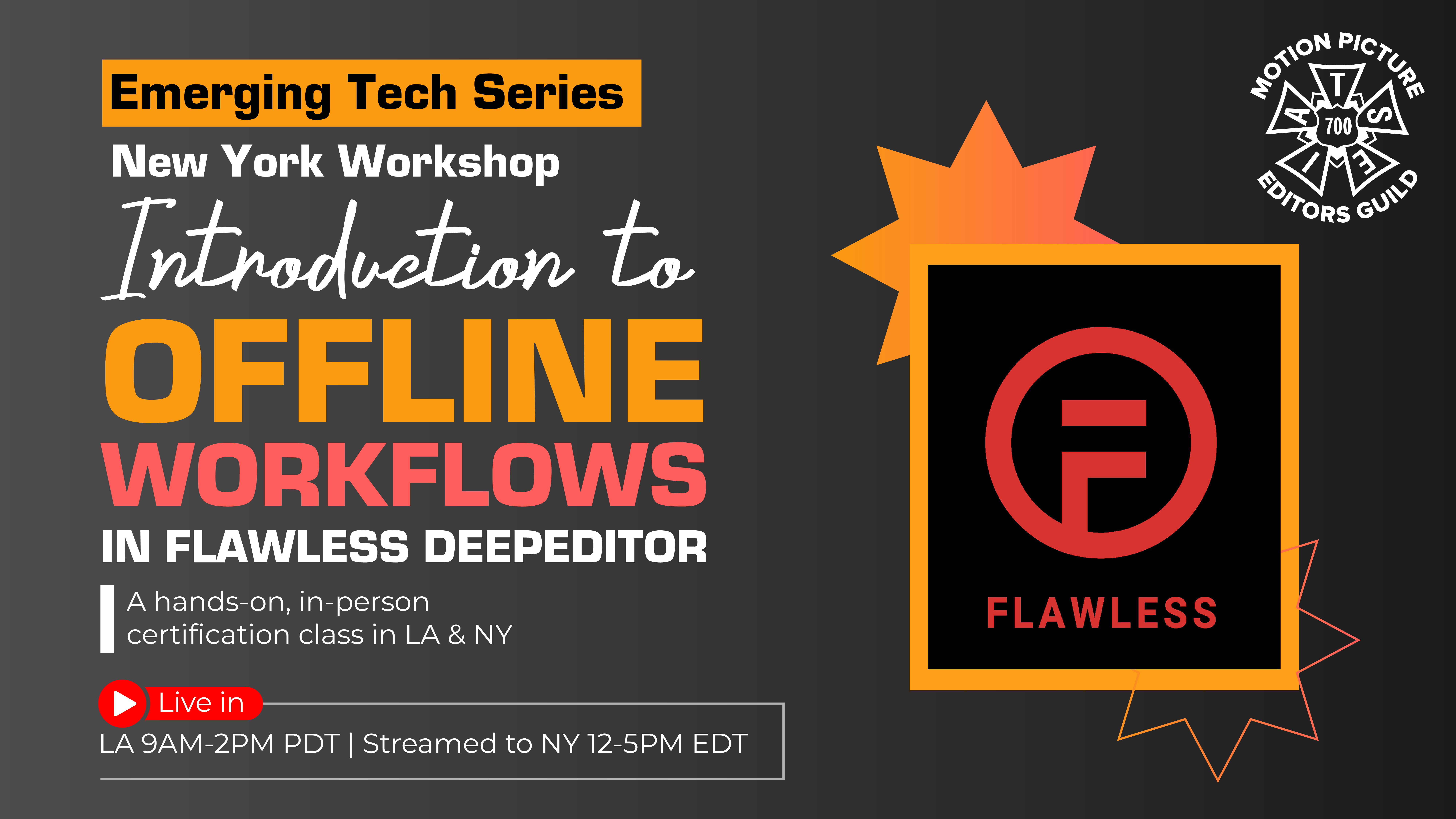 Emerging Tech Series - Introduction to Offline Workflows in Flawless DeepEditor Saturday, October 25, 2025 12:00 PM - 5:00 PM Training/Technology New York Flawless DeepEditor is transforming post-production workflows by making high-quality video dubbing (“vubbing”) simple, powerful, and seamless. Live fr...