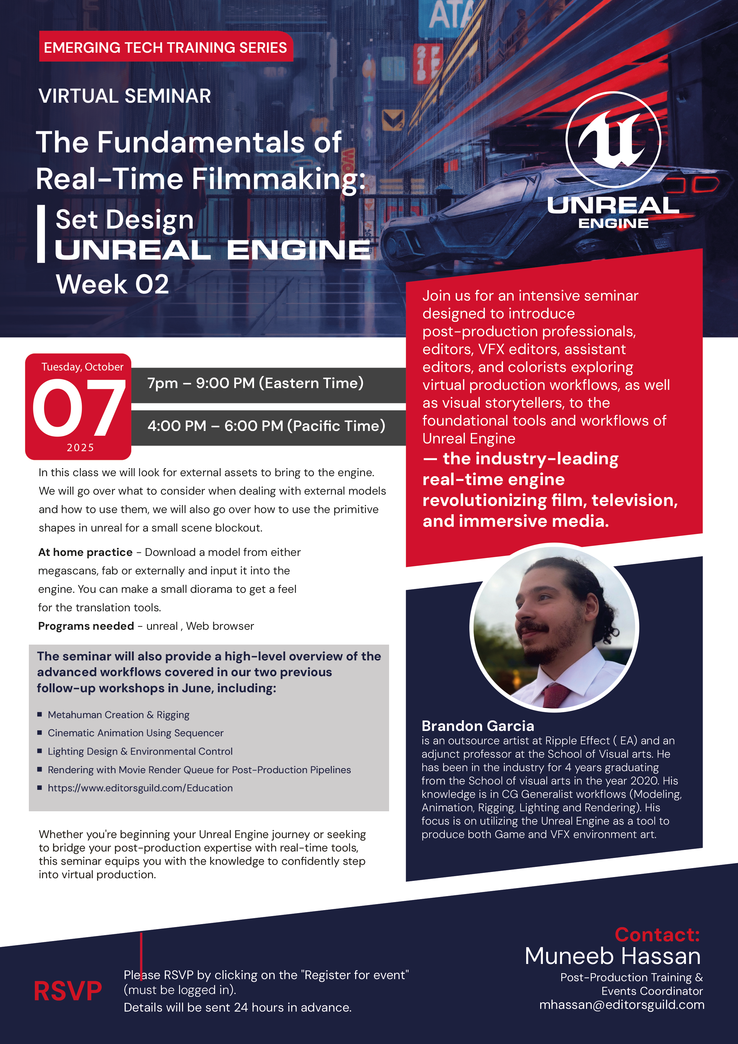 Emerging Tech Series - The Fundamentals of Real-Time Filmmaking: Set Design - Week 2 Tuesday October 07, 2025 4:00 PM - 6:00 PM (Pacific Time) 7:00 PM - 9:00 PM (Eastern Time) Training/Technology