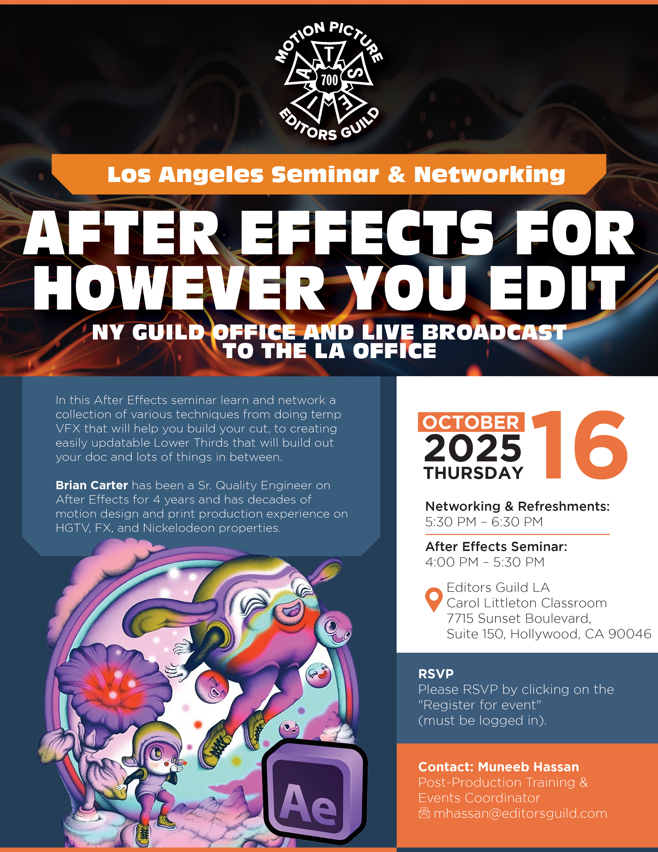 Seminar & Networking - After Effects for However You Edit Thursday October 16, 2025 6:00 PM - 8:30 PM Training/Technology
