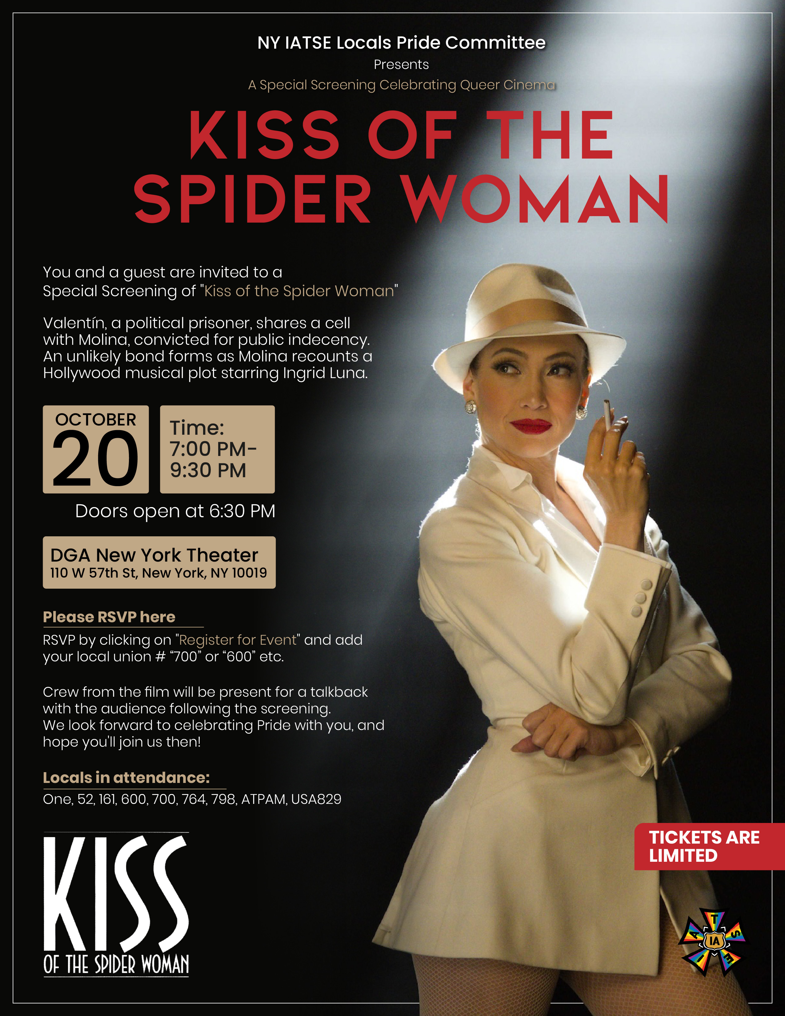 "Kiss of the Spider Woman" - NY IATSE Locals Pride Special Screening Monday October 20, 2025 7:00 PM - 10:00 PM Screening