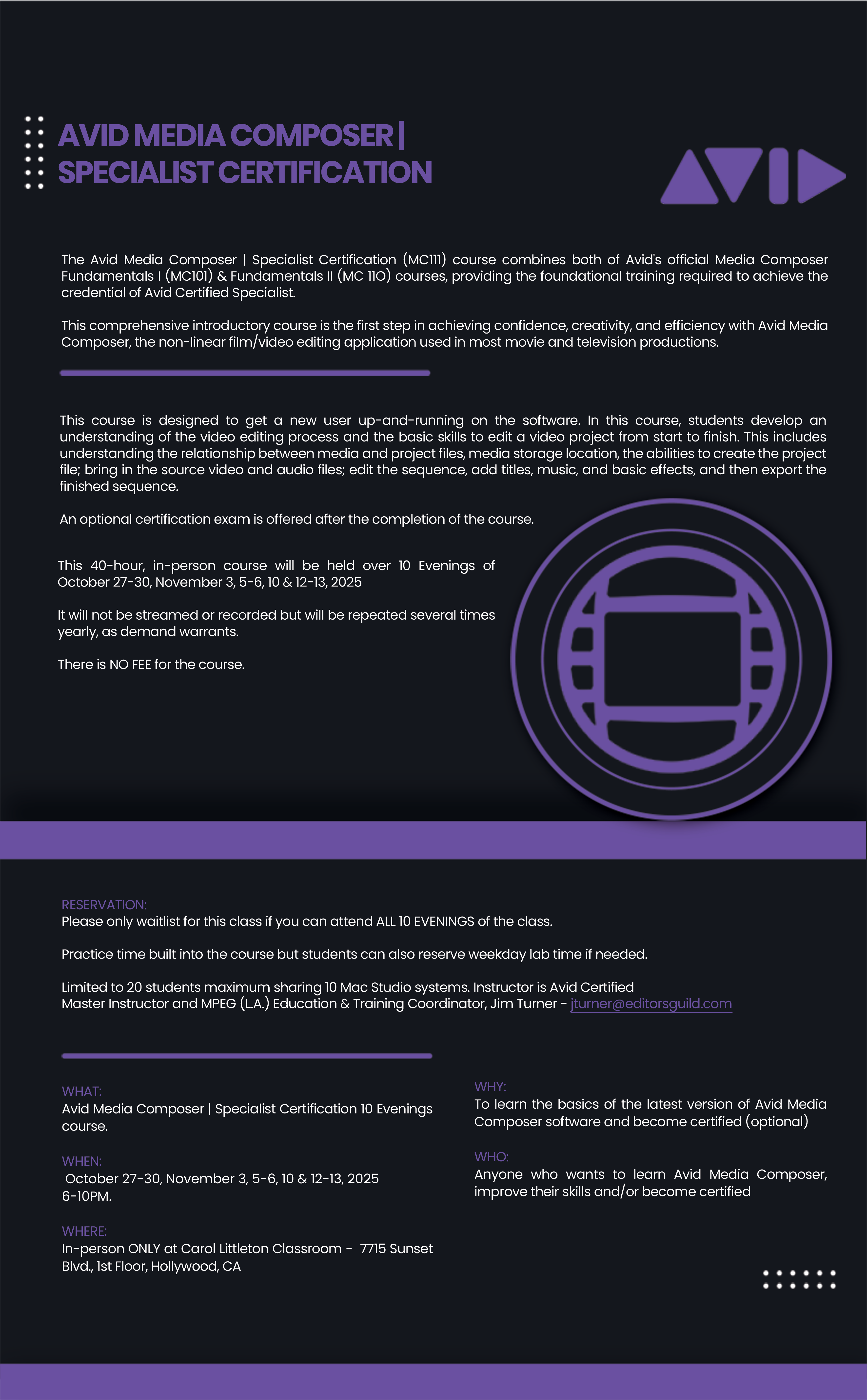 Avid Media Composer | Specialist Certification (10-Weeknights Workshop)