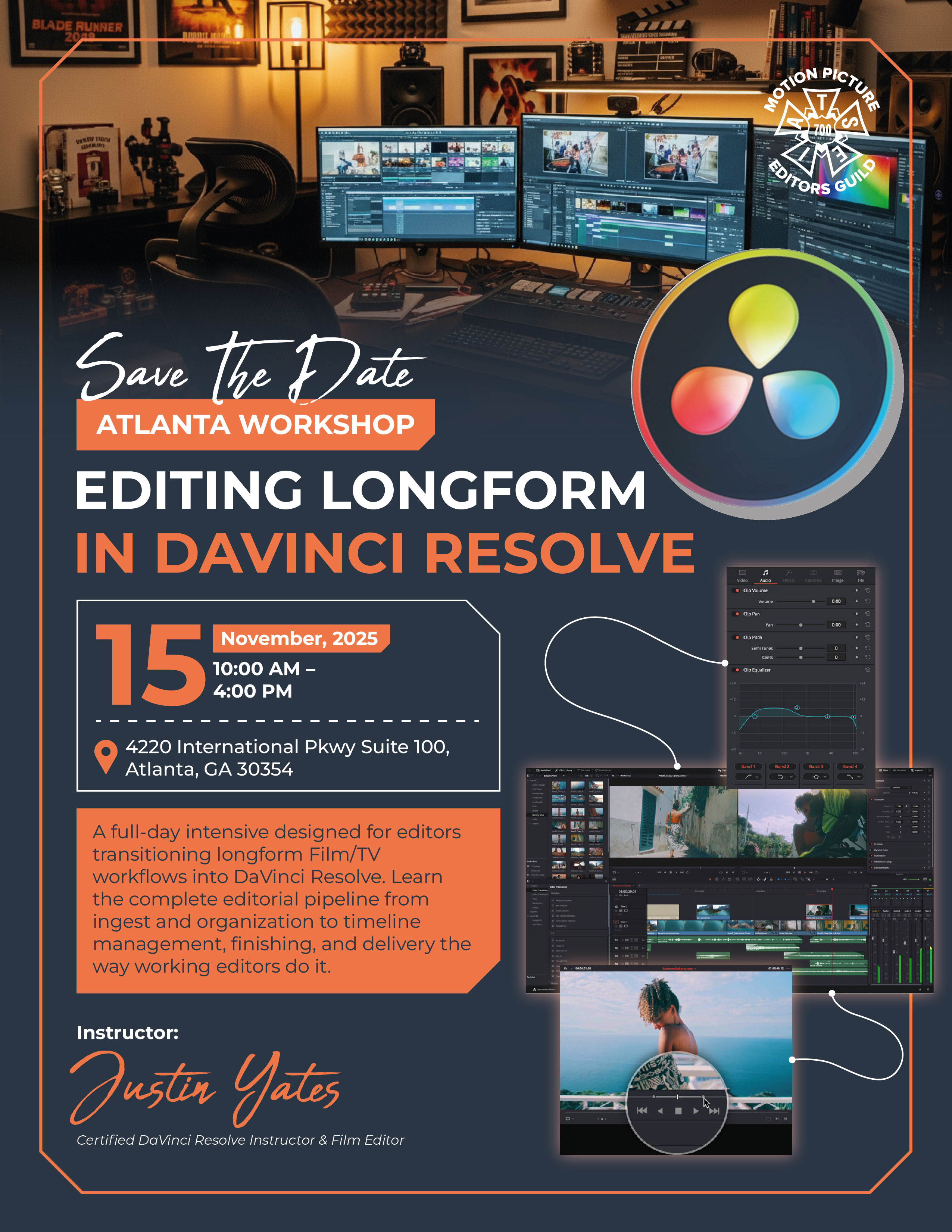 Save the Date - Atlanta Workshop - Editing Longform in DaVinci Resolve Saturday November 15, 2025 10:00 AM - 4:00 PM Training/Technology