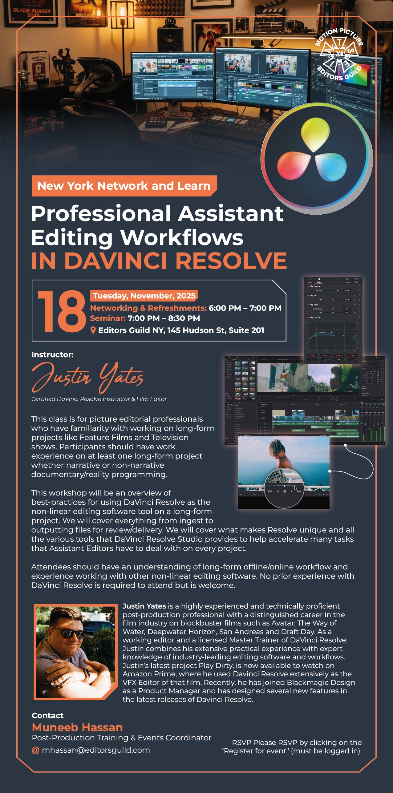 Network & Learn: Seminar - Professional Assistant Editing Workflows in DaVinci Resolve Tuesday November 18, 2025 6:00 PM - 8:30 PM Training/Technology