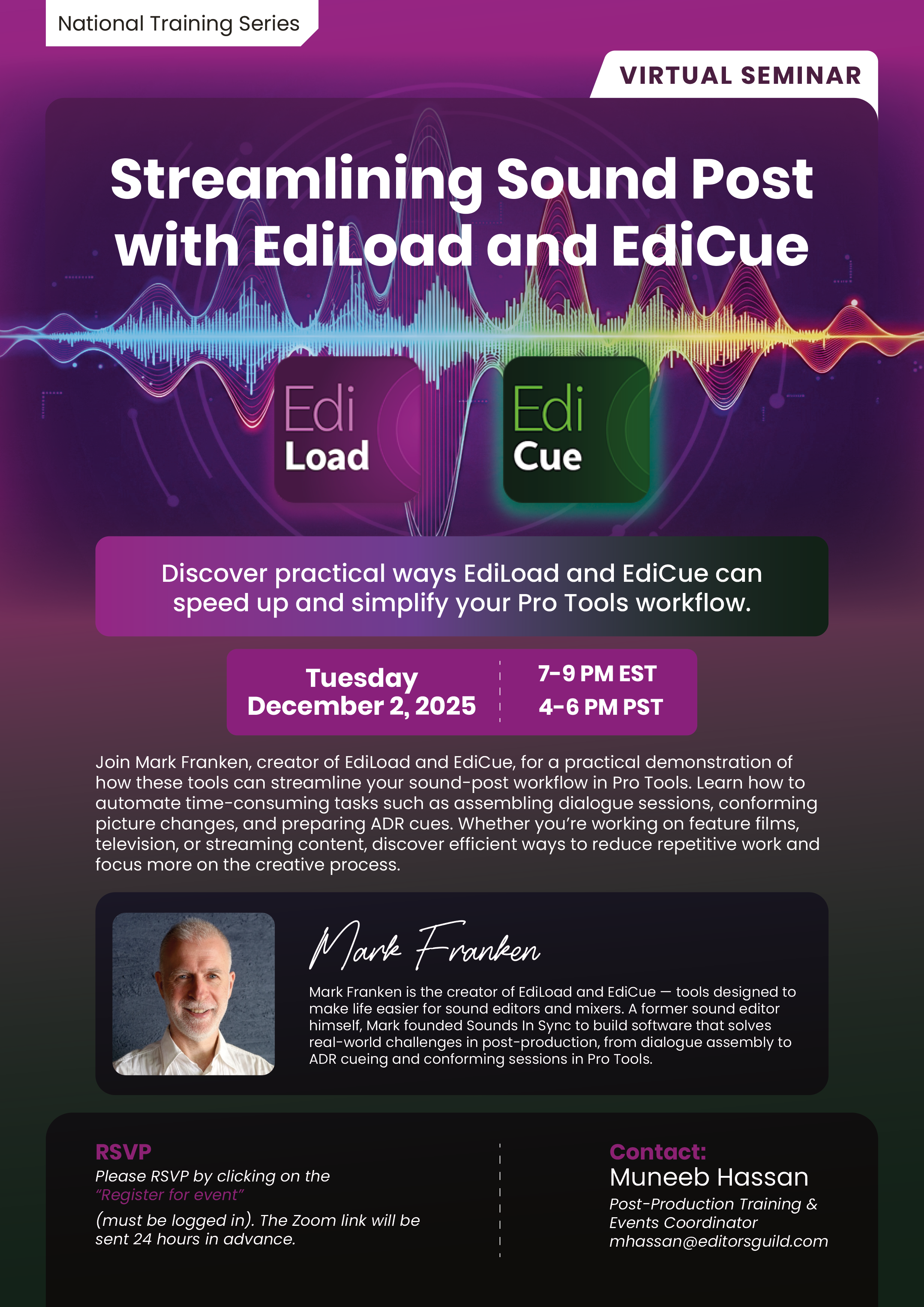 Virtual Seminar: Streamlining Sound Post with EdiLoad and EdiCue Tuesday December 02, 2025 4:00 PM - 6:00 PM (Pacific Time) 7:00 PM - 9:00 PM (Eastern Time) Training/Technology