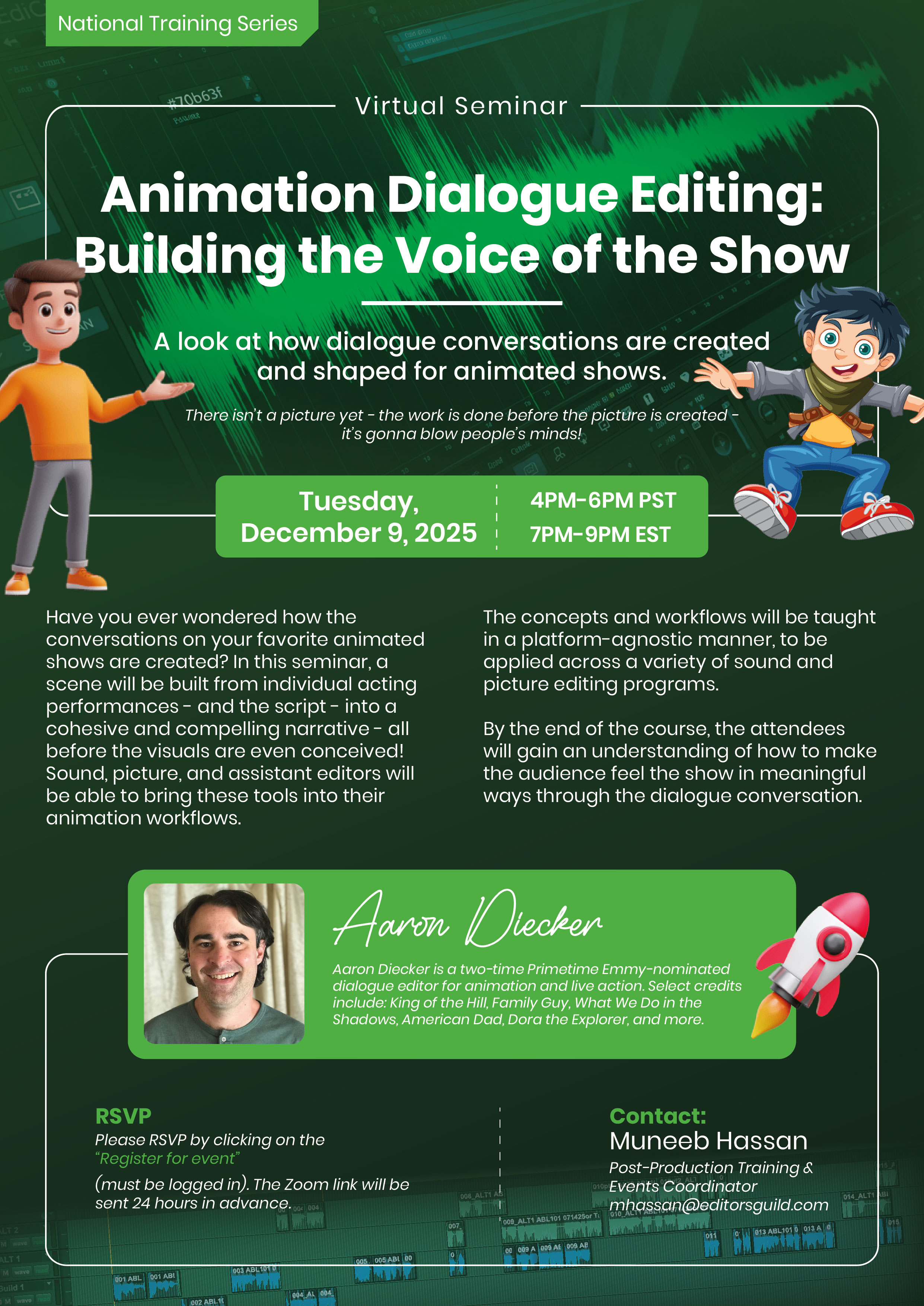Virtual Seminar - Animation Dialogue Editing: Building the Voice of the Show Tuesday December 09, 2025 4:00 PM - 6:00 PM (Pacific Time) 7:00 PM - 9:00 PM (Eastern Time) Training/Technology