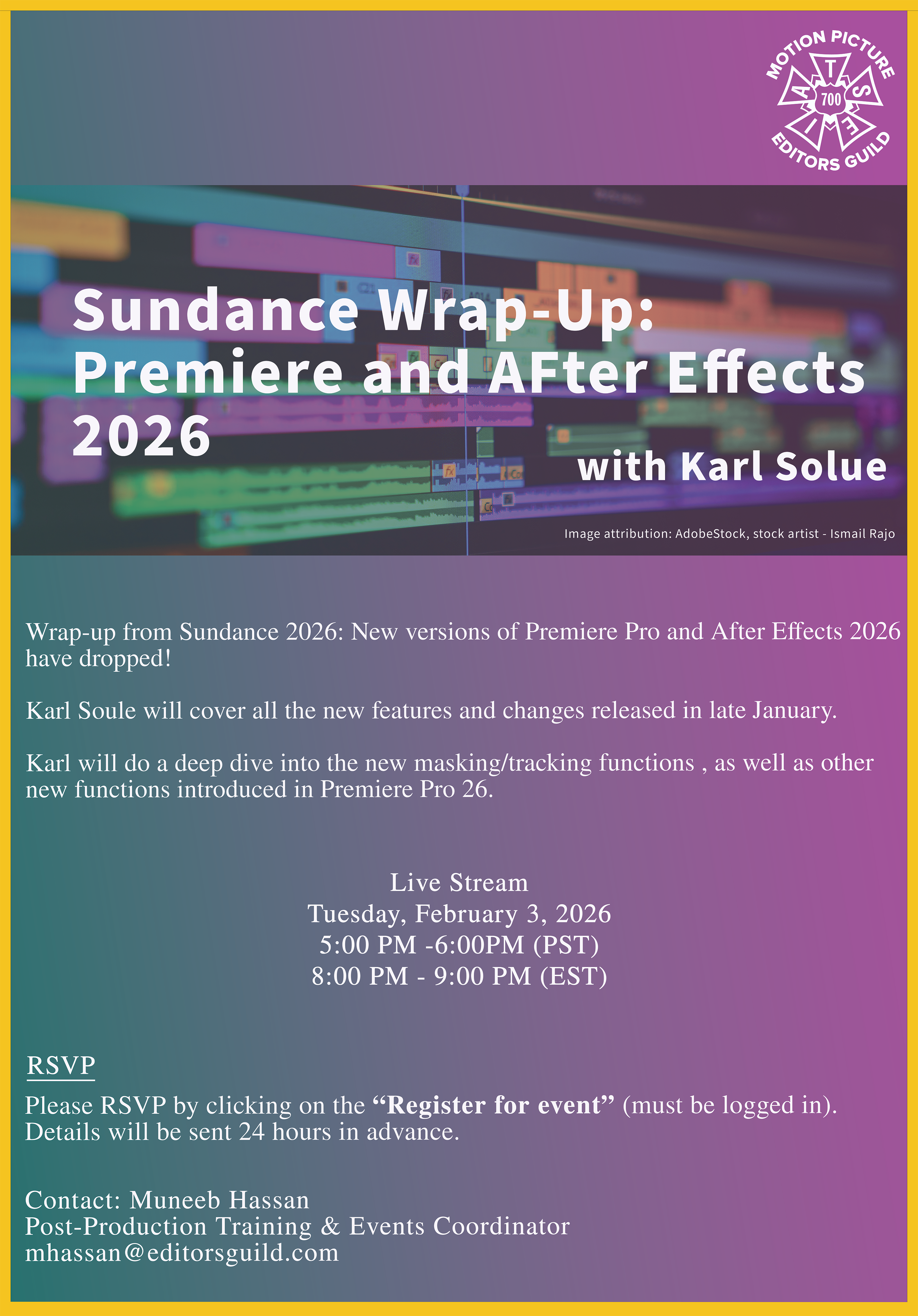 Virtual Seminar - Sundance Wrap-Up: Premiere and After Effects 2026 Tuesday February 03, 2026 5:00 PM - 6:00 PM (Pacific Time) 8:00 PM - 9:00 PM (Eastern Time) Training/Technology