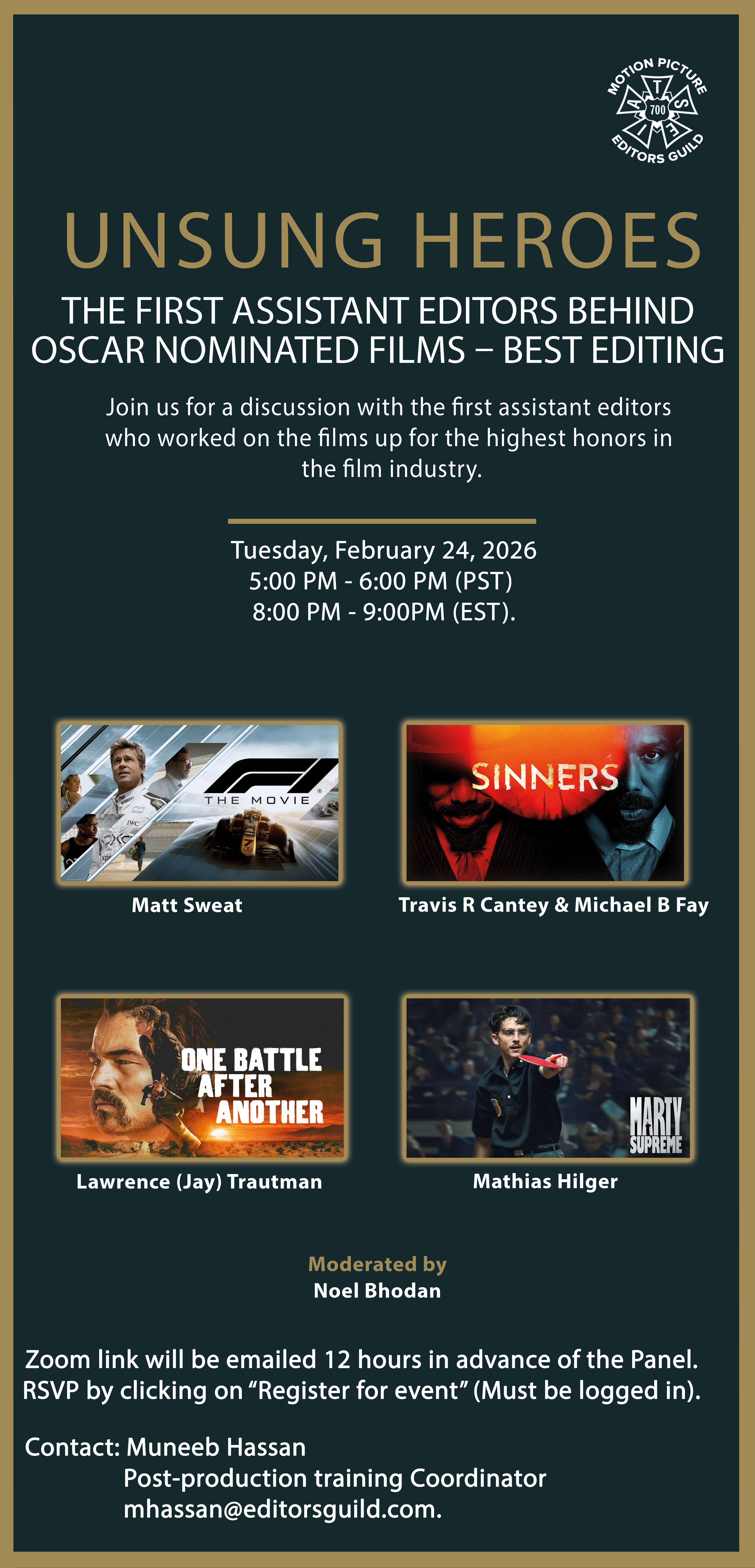 Unsung Heroes – The First Assistant Editors Behind Oscar Nominated Films – Best Editing Tuesday February 24, 2026 5:00 PM - 6:00 PM (Pacific Time) 8:00 PM - 9:00 PM (Eastern Time) Educational