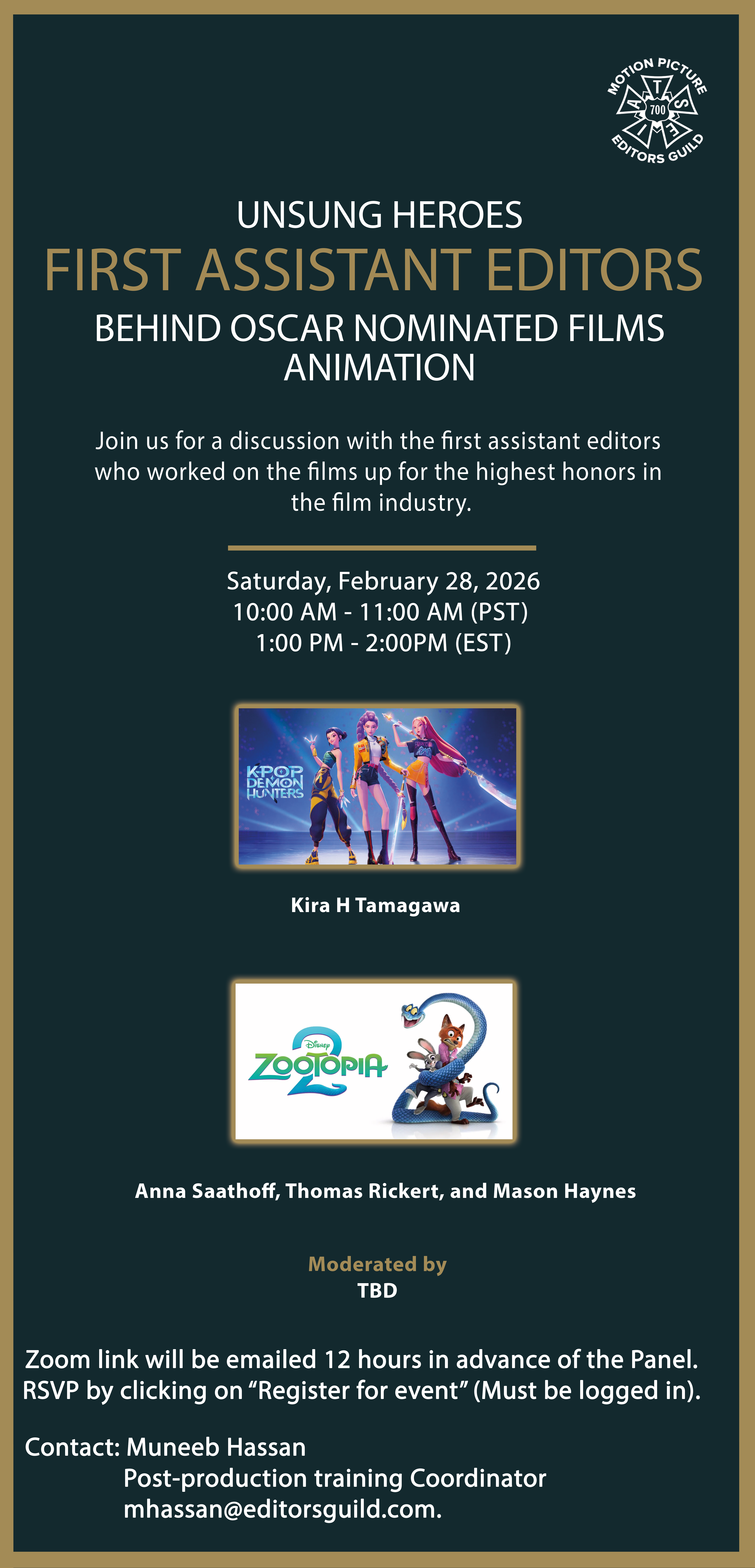 Unsung Heroes – The First Assistant Editors Behind Oscar Nominated Films – Best Editing Tuesday February 24, 2026 5:00 PM - 6:00 PM (Pacific Time) 8:00 PM - 9:00 PM (Eastern Time) Educational