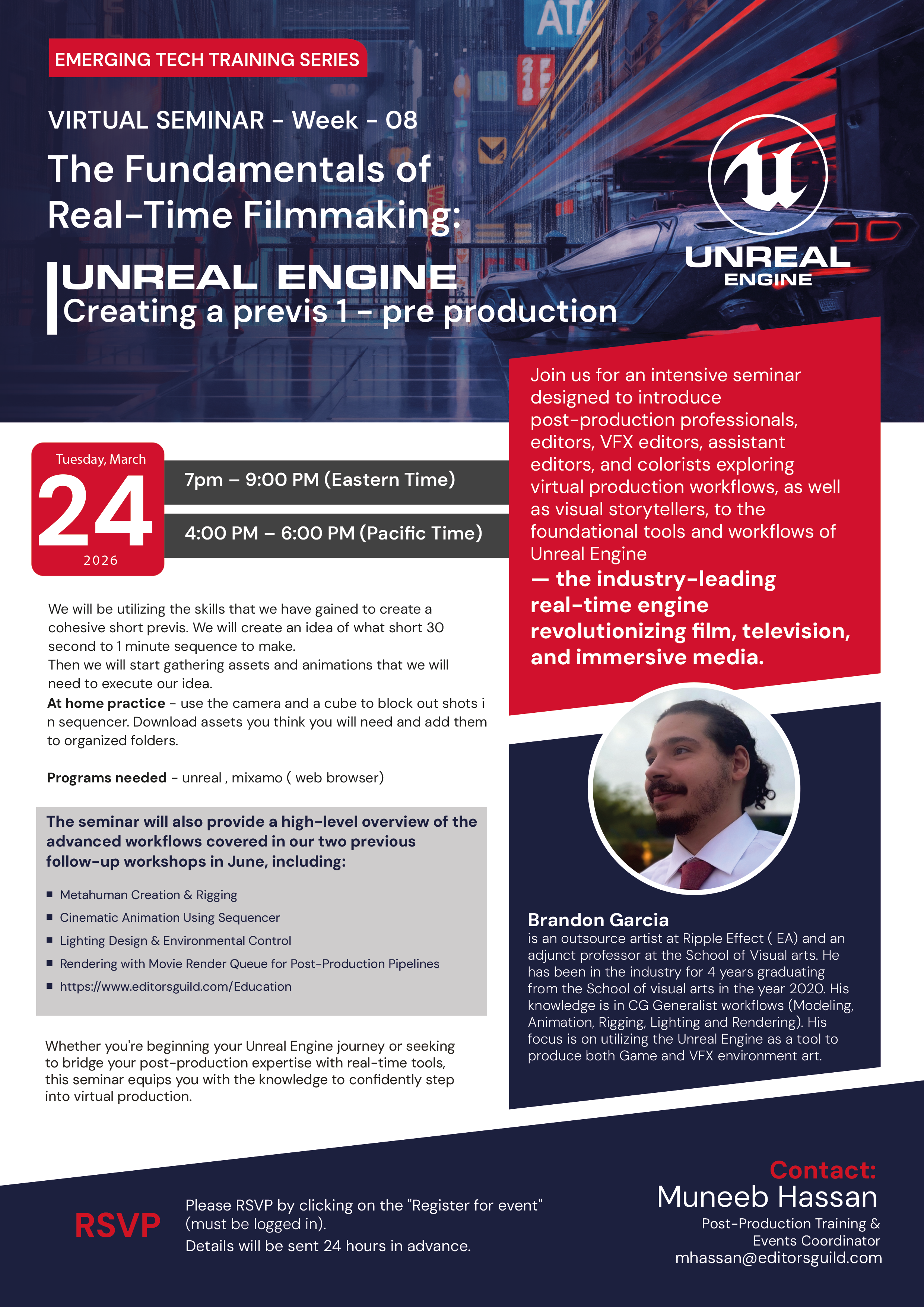 Emerging Tech Series: Unreal Engine - Creating a Previs 1 - Pre Production - Week 08 Tuesday March 24, 2026 4:00 PM - 6:00 PM (Pacific Time) 7:00 PM - 9:00 PM (Eastern Time) Training/Technology