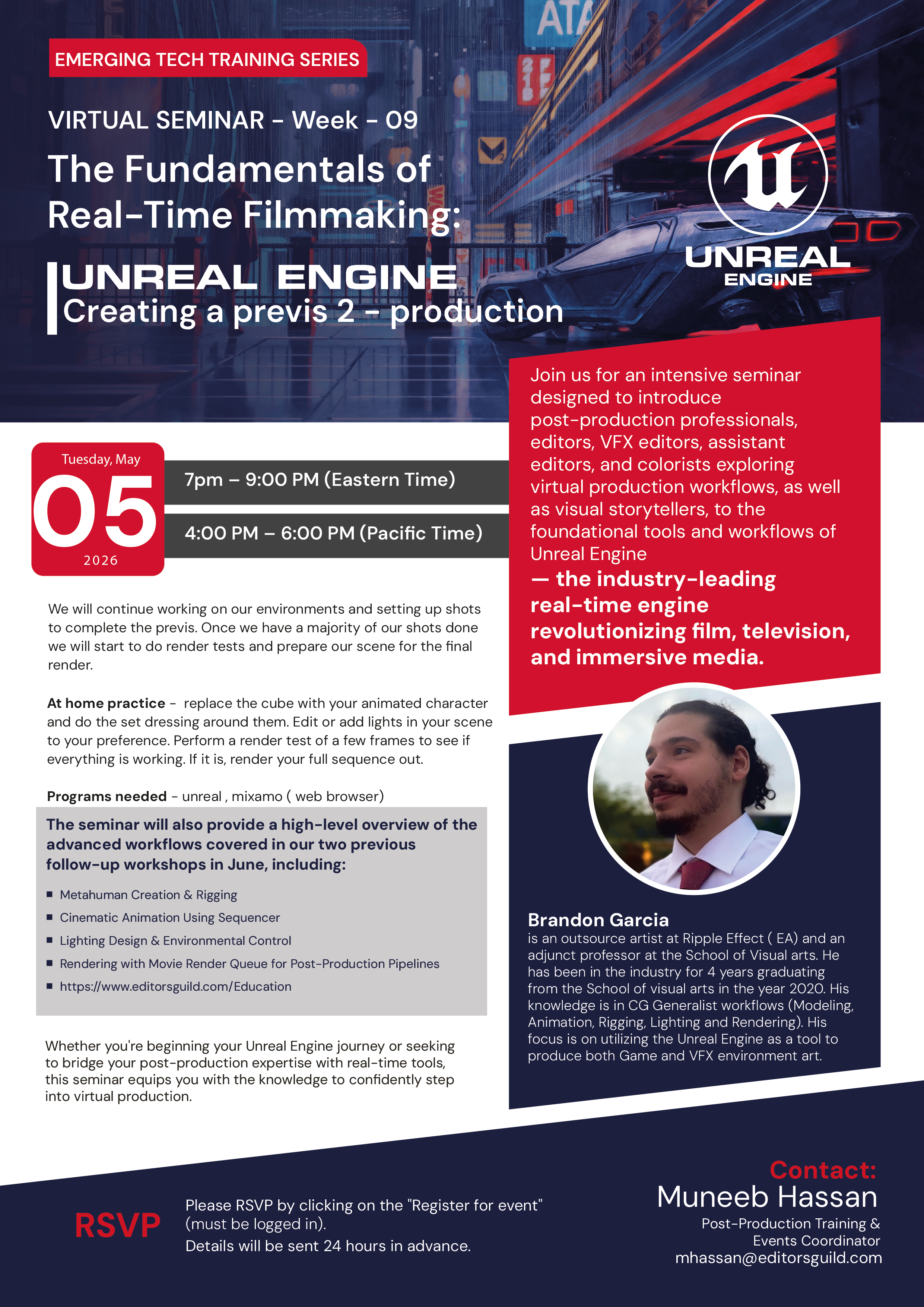 Emerging Tech Series: Unreal Engine - Creating a previs 2 - production Tuesday May 05, 2026 4:00 PM - 6:00 PM (Pacific Time) 7:00 PM - 9:00 PM (Eastern Time) Training/Technology