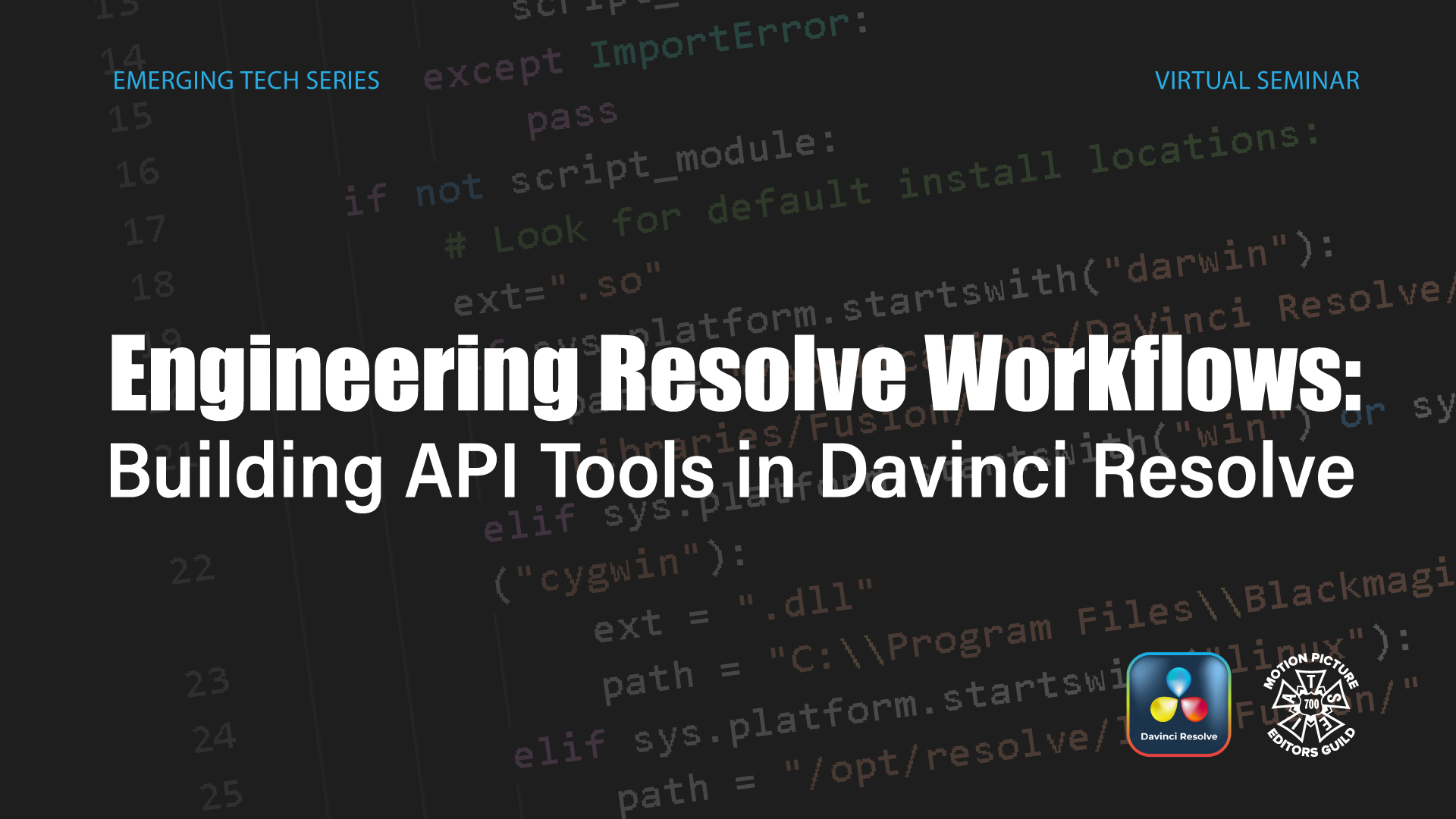 Tuesday, February 10, 2026 Virtual Seminar - Engineering Resolve Workflows: Building API Tools in Davinci Resolve Tuesday, February 10, 2026 4:00 PM - 6:00 PM (Pacific Time) 7:00 PM - 9:00 PM (Eastern Time) Training/Technology Nationwide An introductory class on improving and automating various workflows in DaVinci Resolve using Python scripting and collaborative coding with Large Lang...