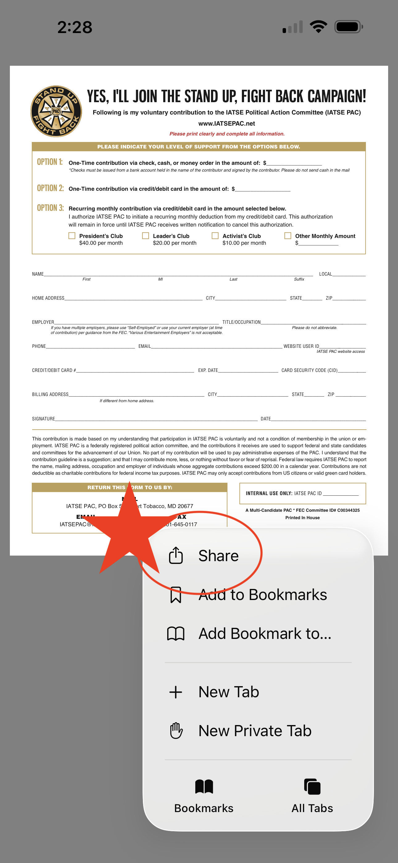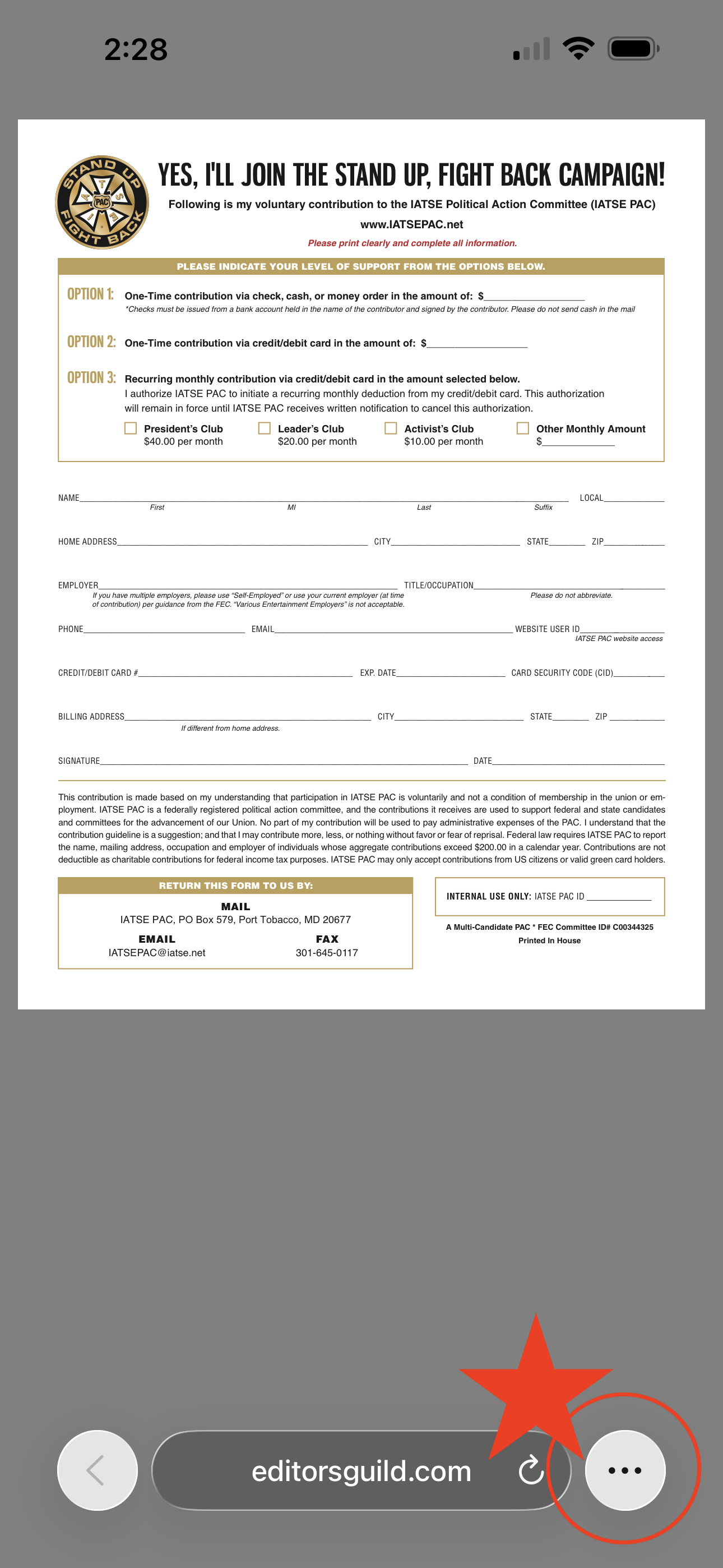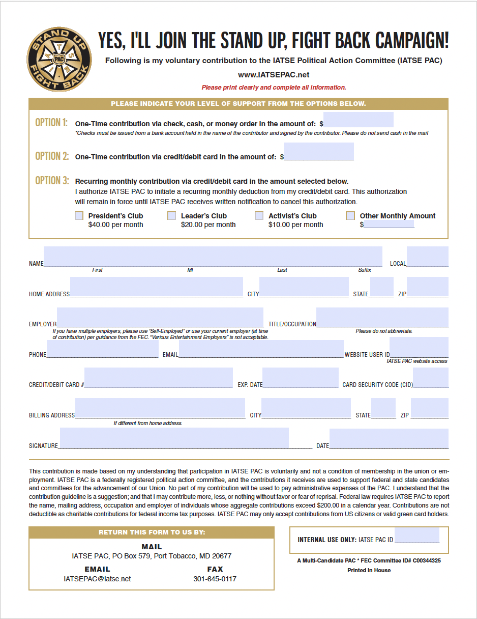 Alternatively, you can complete the form linked on this page and send your completed form to the IATSE PAC via USPS (IATSE PAC, PO Box 579, Port Tobacco, MD 20677) or via electronic mail (IATSEPAC@iatse.net). The IATSE PAC can only accept contributions from IATSE members, retirees, their families, and union staff.