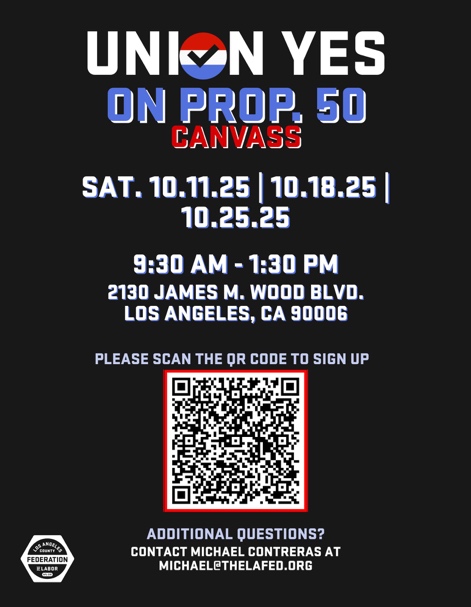 In the upcoming special election in California, the California Federation of Labor Unions and the Los Angeles County Federation of Labor are backing Proposition 50, the Election Rigging Response Act. Prop 50 is a measure that would temporarily redraw congressional district maps in order to counteract the Trump administration’s efforts at gerrymandering in Texas and elsewhere. Trump is trying to move the goalposts in order to maintain a stranglehold on Congress, so that he can rely on a rubberstamp for his assaults upon workers’ rights. Unions are backing Prop 50 because it gives us a chance to elect more pro-labor representatives to push back against the administration’s anti-union, anti-worker agenda.